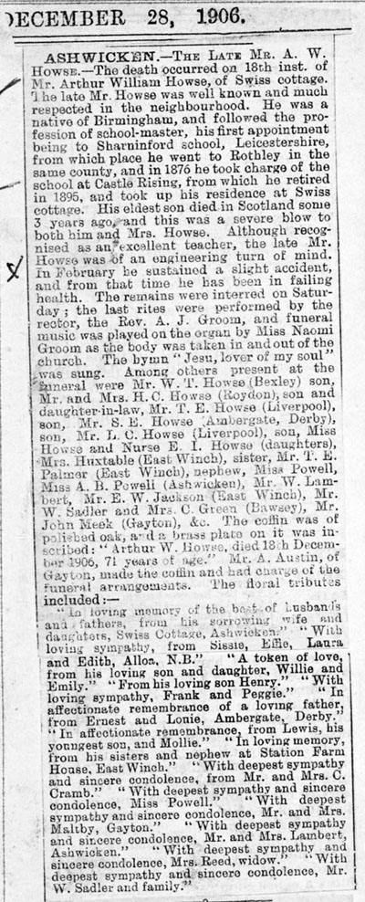 |  C R HUBBER b. Living d.  | ![]()  | ![]()  |  Arthur William HOWSE b.1835 Bordesley, England d.1906 Swiss Cottage, Norfolk  | ||||||||